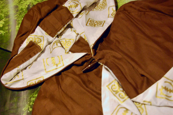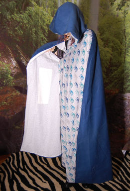 The combination of colors, fabric, ties and hood style are the basis for our unique line of Cloaks. However, we added 3 additional elements to really individualize them for the wearer. A wand pocket. Inside right or left, Approximately 3-4" wide and between 8-12" deep, this way we can accommodate any type or size wand. The only exception is our reversible Cloak. Something different. Next we added a small open pocket at the back neckline, approximately 3"x3", various size and design. For activation of the Throat Chakra which assists use in speaking a clear intent, putting us in touch with our past lives and adding more power to our vocal energies. Even a red marble, placed in the pocket, will create many different results when blended with a few elements: fire work, wind, full moon etc.